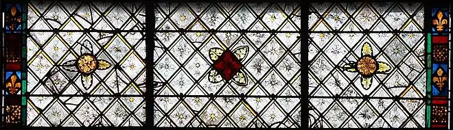 Tous les fonds sont formés de losanges de verre blanc, bordés par une résille jaune. La résille est réalisée par un jaune d'argent ajouté aux losanges, et est bordée d'un côté par une grisaille foncée, de l'autre par le plomb de sertissage des éléments de verre.