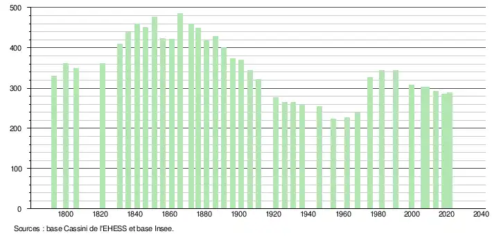 L'évolution du nombre d'habitants est connue à travers les recensements de la population effectués dans la commune depuis 1793. Pour les communes de moins de 10 000 habitants, une enquête de recensement portant sur toute la population est réalisée tous les cinq ans, les populations légales des années intermédiaires étant quant à elles estimées par interpolation ou extrapolation[24]. Pour la commune, le premier recensement exhaustif entrant dans le cadre du nouveau dispositif a été réalisé en 2008[25].