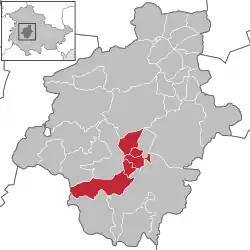 Elle est située dans le sud de l'arrondissement, à la limite avec l'arrondissement de Schmalkalden-Meiningen, entre la ville de Gotha au nord, la vallée de l'Apfelstädt, la forêt de Thuringe et le Rennsteig au sud.