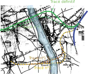 Pour mémoire, une variante, dite de Pisserate, fut présentée dans les mêmes années, dans laquelle la traversée de la Loire était reportée à plus de deux kilomètres en aval de la ville. Ce déplacement avait pour conséquence un allongement de parcours considérable, et n'était guère motivé que par la crainte de rencontrer des difficultés insurmontables dans l'exécution de la tranchée de 13 mètres de profondeur.