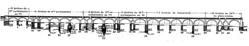 Les dispositions définitivement adoptées consistent en des pleins cintres de 16 mètres d'ouverture tant que la hauteur disponible le permet, ensuite on passe, par l'intermédiaire d'arches de transition, à des voûtes de même ouverture surbaissées au tiers environ[6], puis successivement à des voûtes surbaissées de 15, 14 et 13 mètres d'ouverture.