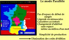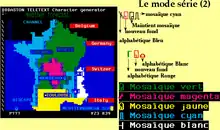 Les deux images ci-dessous représentent la même page, photographiées sur une console de création de pages fonctionnant selon le mode série. Sur la seconde version, on a activé la fonction de visualisation des codes d'attributs sous forme de caractères visibles. Cette version permet de comprendre les contraintes du mode série en montrant notamment le nombre d'espaces requis pour gérer les attributs. On peut voir que les caractères blast through, ne requérant aucun espace pour être visualisés quand on est en mode graphique (comme on appelle aussi le mode mosaïque). On peut également voir la séquence de trois ou quatre codes requis pour commencer une page quand il y a un fond : couleur du caractère suivi de nouveau fond fixent la couleur du fond. Si on en reste là, les caractères seront inscrits dans la même couleur que le fond, ce qui les rendrait peu visibles. Il faut donc à nouveau fixer la couleur du caractère qui va suivre. Si celui-ci est alphabétique, on en reste là. Sinon, on prescrit aussi un « maintien du graphique » qui permet de remplacer l'espace requis par les codes d'attributs à venir sur la même rangée par une répétition du caractère graphique précédent : on voit ce que cela donne sur la première rangée pour le code « mosaïque vert » au niveau du Pas de Calais.