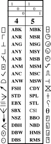 ![]() Table de code des attributs série. On a fait figurer les symboles des codes de changement d'attribut tels que visualisés par certaines consoles d'édition britanniques (ASTON, par ex.). |