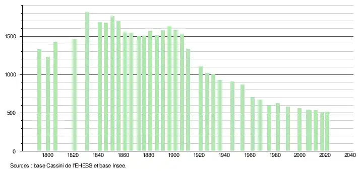 | L'évolution du nombre d'habitants est connue à travers les recensements de la population effectués dans la commune depuis 1793. Pour les communes de moins de 10 000 habitants, une enquête de recensement portant sur toute la population est réalisée tous les cinq ans, les populations légales des années intermédiaires étant quant à elles estimées par interpolation ou extrapolation[23]. Pour la commune, le premier recensement exhaustif entrant dans le cadre du nouveau dispositif a été réalisé en 2007[24]. En 2021, la commune comptait 516 habitants[Note 2], en diminution de 2,46 % par rapport à 2015 (Gers : +0,79 %, France hors Mayotte : +1,84 %). |