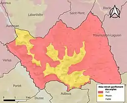 Le retrait-gonflement des sols argileux est susceptible d'engendrer des dommages importants aux bâtiments en cas d’alternance de périodes de sécheresse et de pluie. 99,9 % de la superficie communale est en aléa moyen ou fort (94,5 % au niveau départemental et 48,5 % au niveau national). Sur les 352 bâtiments dénombrés sur la commune en 2019, 352 sont en aléa moyen ou fort, soit 100 %, à comparer aux 93 % au niveau départemental et 54 % au niveau national. Une cartographie de l'exposition du territoire national au retrait gonflement des sols argileux est disponible sur le site du BRGM[19],[Carte 2].