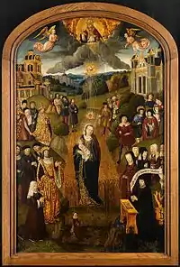 - Soest, Wiesenkirche : panneau vers 1450-1480. (Attribué au Maître westphalien de 1473 ; la donatrice offre la couronne de roses; à droite un prisonnier dont les pieds sont pris dans un carcan.)