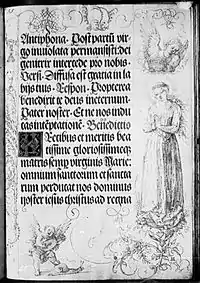 - Munich, Bayerisches Nationalmuseum : Livre d'heures de l’empereur Maxilimien Ier, dessin d'Albrecht Dürer, folio 51r. 1514-1515.