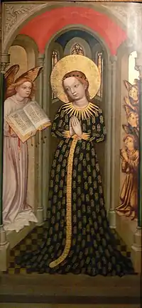 - Munich, Bayerisches Nationalmuseum : Panneau du Maître du retable de Bamberg de 1429 (de), vers 1430. (Un ange présente un livre de prières à la Vierge somptueusement vêtue ; à droite trois anges superposés sont en prières.)