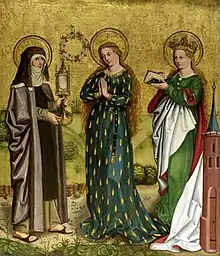 - Durham (Caroline du Nord) Nasher Museum of Art at Duke University (en) : Panneau de retable, Vierge aux épis entourée des saintes Claire et Barbe, vers 1470-1480. (Les trois personnes sont debout devant un fond doré. En plus des attributs usuels - y compris la couronne de roses accrochée au mur - un panier en osier entre la Vierge et sainte Barbe.)