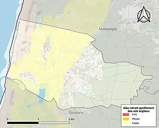 Le retrait-gonflement des sols argileux est susceptible d'engendrer des dommages importants aux bâtiments en cas d’alternance de périodes de sécheresse et de pluie. Aucune partie du territoire de la commune n'est en aléa moyen ou fort (19,2 % au niveau départemental et 48,5 % au niveau national). Sur les 1 792 bâtiments dénombrés sur la commune en 2019, aucun n'est en aléa moyen ou fort, à comparer aux 17 % au niveau départemental et 54 % au niveau national. Une cartographie de l'exposition du territoire national au retrait gonflement des sols argileux est disponible sur le site du BRGM[24],[Carte 2].