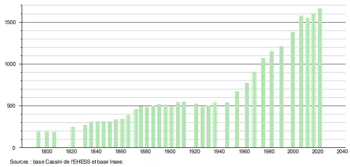 | L'évolution du nombre d'habitants est connue à travers les recensements de la population effectués dans la commune depuis 1793. Pour les communes de moins de 10 000 habitants, une enquête de recensement portant sur toute la population est réalisée tous les cinq ans, les populations légales des années intermédiaires étant quant à elles estimées par interpolation ou extrapolation[28]. Pour la commune, le premier recensement exhaustif entrant dans le cadre du nouveau dispositif a été réalisé en 2006[29]. En 2021, la commune comptait 1 660 habitants[Note 3], en augmentation de 5,06 % par rapport à 2015 (Landes : +4,9 %, France hors Mayotte : +1,84 %). |
