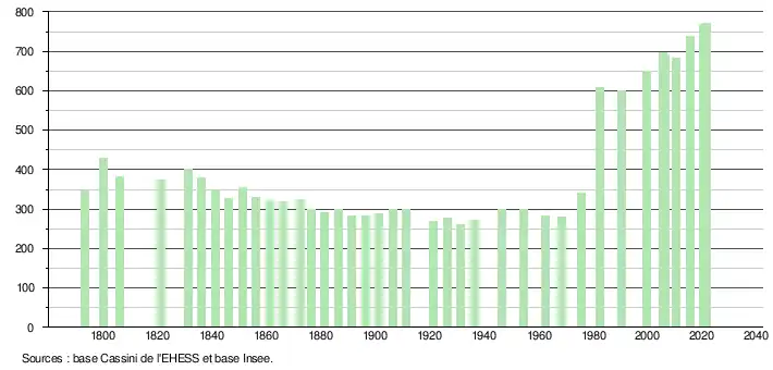 L'évolution du nombre d'habitants est connue à travers les recensements de la population effectués dans la commune depuis 1793. Pour les communes de moins de 10 000 habitants, une enquête de recensement portant sur toute la population est réalisée tous les cinq ans, les populations légales des années intermédiaires étant quant à elles estimées par interpolation ou extrapolation[24]. Pour la commune, le premier recensement exhaustif entrant dans le cadre du nouveau dispositif a été réalisé en 2005[25].