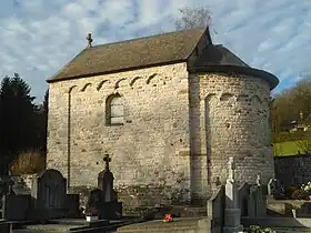 L'ancienne église datant du XIIe siècle partiellement détruite à la fin du XIXe siècle a conservé son chœur qui se trouve dans le cimetière actuel. Devenue chapelle romane de Vieuxville, elle est reprise sur la liste du patrimoine exceptionnel de la Région wallonne pour la qualité de ses peintures murales.