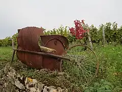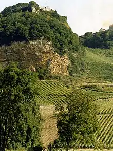 Il existe encore quelques rares vignes implantées en terrasses. Elles permettaient de mieux travailler les parcelles et d'éviter une certaine érosion lors des épisodes pluvieux intenses. Avec les machines actuelles, cette implantation est en voie de disparition. On plante dans le sens de la pente.
