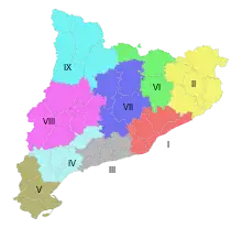 La Catalogne est divisée en huit divisions territoriales, appelées vigueries (vegueries en catalan). Les vigueries sont subdivisées en comarques et en communes, à l'exception d'Aran, considérée comme une "entité territoriale unique"[1].