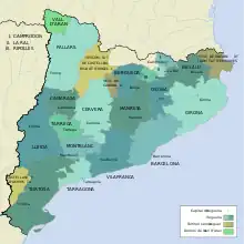Au XIIe siècle existaient dix vigueries, qui se sont progressivement élargies[15]. À l'époque de Jacques II d'Aragon, les vigueries en vigueur étaient : Bages (ou Manresa), Barcelone, Berguedà (ou Berga), Besaltú, Camarasa, Camprodon, Cervera, Lérida, Montblanc, Osona (ou Vic), Pallars, Ral, Ribagorça, Ripoll (ou Ripollès), Tarragonne, Tàrrega, Tortosa et Vilafranca del Penedès.