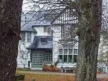 Toitures aux versants multiples en ardoises grises du pays, ravissante petite tourelle sur le côté gauche de la façade, pignon latté, baies agrémentées de petits bois blancs formant une multitude de carrés vitrés, briques peintes en blanc, treille recouverte de végétation et parc arboré procurent une belle harmonie à cette construction aux allures de manoir anglo-normand.