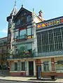 Le bâtiment est orné d'une grande véranda à vitraux polychrome et s’unit en angle avec une grande tourelle surmontée d'un clocheton[5].