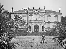 Un ensemble de terrasses et de volées d’escaliers constituent la base sur laquelle est posée la villa[5]. La structure est tournée sur l'avant-corps central figuré par un porche monumental surmonté d'une terrasse à balustres ; enfin, un troisième niveau rappelant un arc triomphal dont le couronnement est constitué par une balustrade à pots à feu.