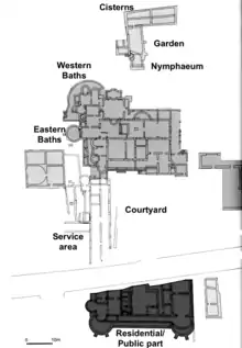 Les pièces d'un grand complexe thermal privé, accessibles depuis un portique, ont été mises en lumière. Elles sont richement décorées de mosaïques, dont celle figurative du frigidarium (« salle des Néréides »), datée du IIIe siècle, laquelle représente en grands carreaux blancs et verts un thiasus marin avec quatre figures féminines chevauchant un lion, un taureau, un cheval et un tigre se terminant par une queue de poisson. La pièce a un plan octogonal avec quatre côtés en absides et dispose de deux bassins d'eau froide. Le caldarium, doté d'un système de chauffage hypocauste et de tuyaux en terre cuite sur les murs, présente également un plan octogonal et un petit sol en mosaïque et devait être recouvert d'une voûte. La villa possédait aussi un tepidarium, intermédiaire entre le caldarium et le frigidarium. L'ensemble comprend également une salle rectangulaire pavée de dalles de marbre coloré (opus sectile).