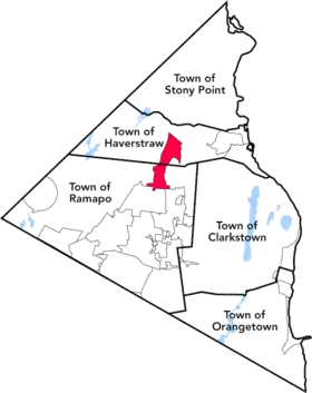 Le village de Pomona dans l'État de New York, en rouge, est à cheval sur les villes de Ramapo et Haverstraw. L'État de New York compte 553 villages.