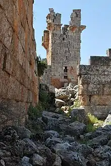 Autres bâtiments énigmatiques, les tours qui dominent nombre de villages et dont, là encore, la fonction n'a pas été entièrement élucidée[12]. Certaines dépassent les dix mètres de hauteur. Il en est qui présentent un seul étage, et servaient sans doute de logement à des ermites. Cette utilisation est tout à fait plausible pour des tours comme celle de Refade, près du monastère Saint-Siméon-le-Stylite[14]. Dans les régions montagneuses, où les attaques des nomades étaient peu probables, les tours isolées ont pu également servir de lieux de retraite pour les moines et les ermites.