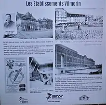 En 1890, Henry de Vilmorin construit un premier établissement relié à la voie ferrée de Massy-Palaiseau qui se développe avec création, autour de pépinières, de hangars de stockage, de magasins, d'une écurie et de maisons. Un grand bâtiment de 4 étages de 120 mètres de long sur 30 mètres de large est construit en 1940 abritant le centre de conditionnement et d'expéditions des graines.