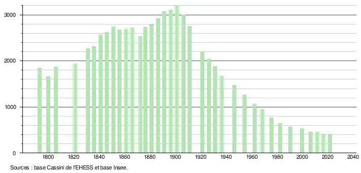 L'évolution du nombre d'habitants est connue à travers les recensements de la population effectués dans la commune depuis 1793. Pour les communes de moins de 10 000 habitants, une enquête de recensement portant sur toute la population est réalisée tous les cinq ans, les populations légales des années intermédiaires étant quant à elles estimées par interpolation ou extrapolation[24]. Pour la commune, le premier recensement exhaustif entrant dans le cadre du nouveau dispositif a été réalisé en 2006[25].