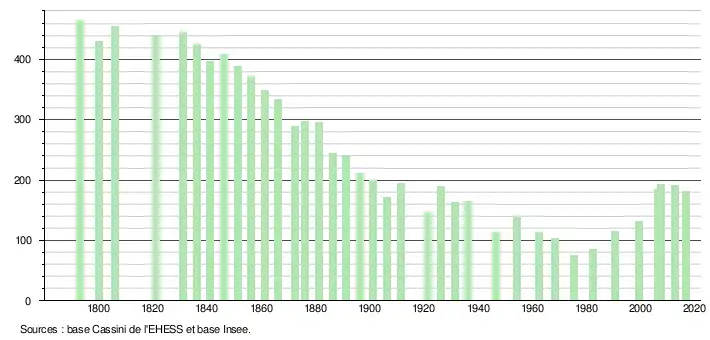 L'évolution du nombre d'habitants est connue à travers les recensements de la population effectués dans la commune depuis 1793. Pour les communes de moins de 10 000 habitants, une enquête de recensement portant sur toute la population est réalisée tous les cinq ans, les populations légales des années intermédiaires étant quant à elles estimées par interpolation ou extrapolation[2]. Pour la commune, le premier recensement exhaustif entrant dans le cadre du nouveau dispositif a été réalisé en 2007[3].