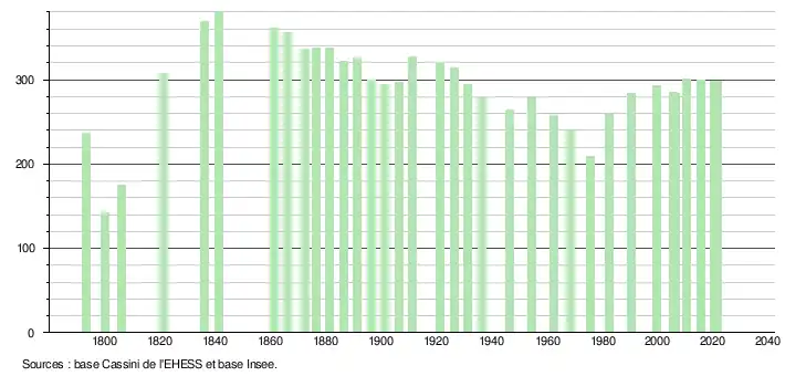 L'évolution du nombre d'habitants est connue à travers les recensements de la population effectués dans la commune depuis 1793. Pour les communes de moins de 10 000 habitants, une enquête de recensement portant sur toute la population est réalisée tous les cinq ans, les populations légales des années intermédiaires étant quant à elles estimées par interpolation ou extrapolation[26]. Pour la commune, le premier recensement exhaustif entrant dans le cadre du nouveau dispositif a été réalisé en 2005[27].