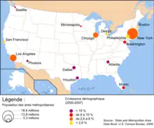 Les États-Unis sont le troisième pays sur Terre pour la population urbaine, en valeur absolue[1]. Plus de 30 % des Américains vivent dans une métropole de plus de cinq millions d'habitants[2]. Ces agglomérations sont récentes et structurées en réseaux. Leur poids économique est considérable pour le pays. L'immigration, les mutations sociales et la mondialisation les ont façonnées.