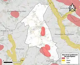 Le retrait-gonflement des sols argileux est susceptible d'engendrer des dommages importants aux bâtiments en cas d’alternance de périodes de sécheresse et de pluie. 9,9 % de la superficie communale est en aléa moyen ou fort (67,4 % au niveau départemental et 48,5 % au niveau national). Sur les 374 bâtiments dénombrés sur la commune en 2019, 5 sont en aléa moyen ou fort, soit 1 %, à comparer aux 81 % au niveau départemental et 54 % au niveau national. Une cartographie de l'exposition du territoire national au retrait gonflement des sols argileux est disponible sur le site du BRGM[20],[Carte 3].