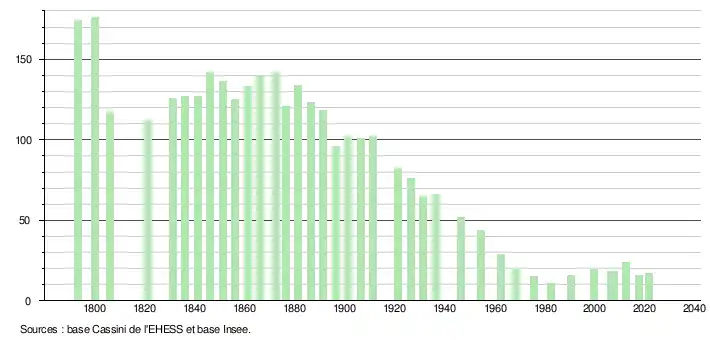 L'évolution du nombre d'habitants est connue à travers les recensements de la population effectués dans la commune depuis 1793. Pour les communes de moins de 10 000 habitants, une enquête de recensement portant sur toute la population est réalisée tous les cinq ans, les populations légales des années intermédiaires étant quant à elles estimées par interpolation ou extrapolation[18]. Pour la commune, le premier recensement exhaustif entrant dans le cadre du nouveau dispositif a été réalisé en 2007[19].