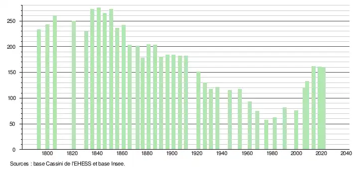 L'évolution du nombre d'habitants est connue à travers les recensements de la population effectués dans la commune depuis 1793. Pour les communes de moins de 10 000 habitants, une enquête de recensement portant sur toute la population est réalisée tous les cinq ans, les populations légales des années intermédiaires étant quant à elles estimées par interpolation ou extrapolation[25]. Pour la commune, le premier recensement exhaustif entrant dans le cadre du nouveau dispositif a été réalisé en 2008[26].