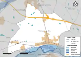 Les crues du Cher sont moins importantes que celles de la Loire, mais elles peuvent générer des dégâts importants. Les crues historiques sont celles de 1856 (5 m à l'échelle de Noyers-sur-Cher), 1940 (4,03 m) et 1977 (3,58 m). Le débit maximal historique est de 1 560 m3/s et caractérise une crue de retour supérieur à cent ans pour Montrichard Val de Cher[44]. Le risque d'inondation est pris en compte dans l'aménagement du territoire de la commune par le biais du Plan de prévention du risque inondation (PPRI) du Cher[45].