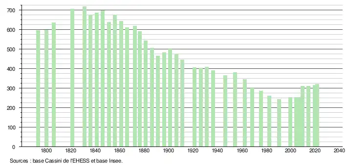 L'évolution du nombre d'habitants est connue à travers les recensements de la population effectués dans la commune depuis 1793. Pour les communes de moins de 10 000 habitants, une enquête de recensement portant sur toute la population est réalisée tous les cinq ans, les populations légales des années intermédiaires étant quant à elles estimées par interpolation ou extrapolation[28]. Pour la commune, le premier recensement exhaustif entrant dans le cadre du nouveau dispositif a été réalisé en 2004[29].