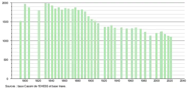 L'évolution du nombre d'habitants est connue à travers les recensements de la population effectués dans la commune depuis 1793. Pour les communes de moins de 10 000 habitants, une enquête de recensement portant sur toute la population est réalisée tous les cinq ans, les populations légales des années intermédiaires étant quant à elles estimées par interpolation ou extrapolation[25]. Pour la commune, le premier recensement exhaustif entrant dans le cadre du nouveau dispositif a été réalisé en 2007[26].