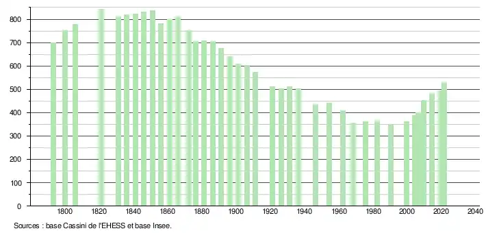| L'évolution du nombre d'habitants est connue à travers les recensements de la population effectués dans la commune depuis 1793. Pour les communes de moins de 10 000 habitants, une enquête de recensement portant sur toute la population est réalisée tous les cinq ans, les populations légales des années intermédiaires étant quant à elles estimées par interpolation ou extrapolation[27]. Pour la commune, le premier recensement exhaustif entrant dans le cadre du nouveau dispositif a été réalisé en 2004[28]. En 2021, la commune comptait 529 habitants[Note 5], en augmentation de 7,74 % par rapport à 2015 (Tarn : +1,82 %, France hors Mayotte : +1,84 %). |