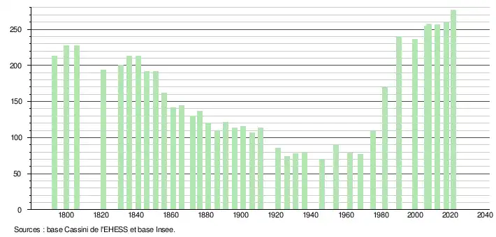 L'évolution du nombre d'habitants est connue à travers les recensements de la population effectués dans la commune depuis 1793. Pour les communes de moins de 10 000 habitants, une enquête de recensement portant sur toute la population est réalisée tous les cinq ans, les populations légales des années intermédiaires étant quant à elles estimées par interpolation ou extrapolation[22]. Pour la commune, le premier recensement exhaustif entrant dans le cadre du nouveau dispositif a été réalisé en 2007[23].