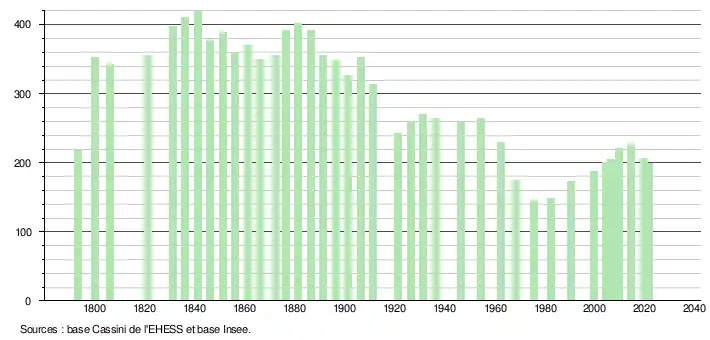 L'évolution du nombre d'habitants est connue à travers les recensements de la population effectués dans la commune depuis 1793. Pour les communes de moins de 10 000 habitants, une enquête de recensement portant sur toute la population est réalisée tous les cinq ans, les populations légales des années intermédiaires étant quant à elles estimées par interpolation ou extrapolation[19]. Pour la commune, le premier recensement exhaustif entrant dans le cadre du nouveau dispositif a été réalisé en 2004[20].