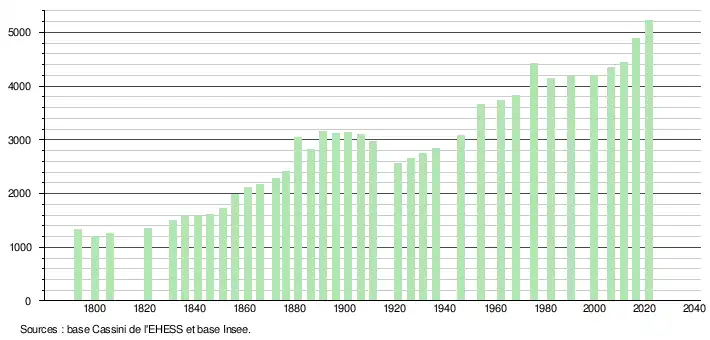 L'évolution du nombre d'habitants est connue à travers les recensements de la population effectués dans la commune depuis 1793. Pour les communes de moins de 10 000 habitants, une enquête de recensement portant sur toute la population est réalisée tous les cinq ans, les populations légales des années intermédiaires étant quant à elles estimées par interpolation ou extrapolation[21]. Pour la commune, le premier recensement exhaustif entrant dans le cadre du nouveau dispositif a été réalisé en 2006[22].