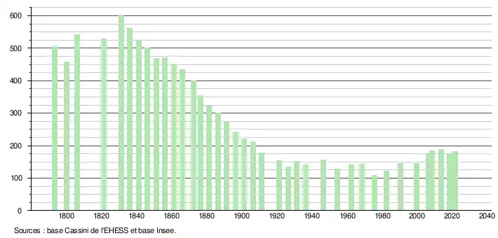L'évolution du nombre d'habitants est connue à travers les recensements de la population effectués dans la commune depuis 1793. Pour les communes de moins de 10 000 habitants, une enquête de recensement portant sur toute la population est réalisée tous les cinq ans, les populations légales des années intermédiaires étant quant à elles estimées par interpolation ou extrapolation[20]. Pour la commune, le premier recensement exhaustif entrant dans le cadre du nouveau dispositif a été réalisé en 2008[21].