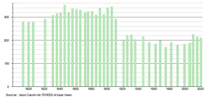 L'évolution du nombre d'habitants est connue à travers les recensements de la population effectués dans la commune depuis 1793. Pour les communes de moins de 10 000 habitants, une enquête de recensement portant sur toute la population est réalisée tous les cinq ans, les populations légales des années intermédiaires étant quant à elles estimées par interpolation ou extrapolation[16]. Pour la commune, le premier recensement exhaustif entrant dans le cadre du nouveau dispositif a été réalisé en 2005[17].