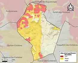 Le retrait-gonflement des sols argileux est susceptible d'engendrer des dommages importants aux bâtiments en cas d’alternance de périodes de sécheresse et de pluie. 58,5 % de la superficie communale est en aléa moyen ou fort (75,2 % au niveau départemental et 48,5 % au niveau national). Sur les 288 bâtiments dénombrés sur la commune en 2019, 288 sont en aléa moyen ou fort, soit 100 %, à comparer aux 94 % au niveau départemental et 54 % au niveau national. Une cartographie de l'exposition du territoire national au retrait gonflement des sols argileux est disponible sur le site du BRGM[32],[Carte 3].