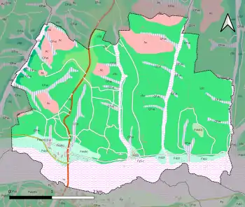 L'occupation des sols de la commune, telle qu'elle ressort de la base de données européenne d’occupation biophysique des sols Corine Land Cover (CLC), est marquée par l'importance des territoires agricoles (77,9 % en 2018), néanmoins en diminution par rapport à 1990 (84,6 %). La répartition détaillée en 2018 est la suivante : zones agricoles hétérogènes (47,1 %), prairies (21,6 %), forêts (13,4 %), terres arables (9,2 %), zones urbanisées (8,5 %), zones industrielles ou commerciales et réseaux de communication (0,3 %)[37]. L'évolution de l’occupation des sols de la commune et de ses infrastructures peut être observée sur les différentes représentations cartographiques du territoire : la carte de Cassini (XVIIIe siècle), la carte d'état-major (1820-1866) et les cartes ou photos aériennes de l'IGN pour la période actuelle (1950 à aujourd'hui)[Carte 3].