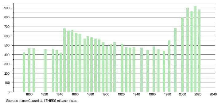 L'évolution du nombre d'habitants est connue à travers les recensements de la population effectués dans la commune depuis 1793. Pour les communes de moins de 10 000 habitants, une enquête de recensement portant sur toute la population est réalisée tous les cinq ans, les populations légales des années intermédiaires étant quant à elles estimées par interpolation ou extrapolation[20]. Pour la commune, le premier recensement exhaustif entrant dans le cadre du nouveau dispositif a été réalisé en 2006[21].