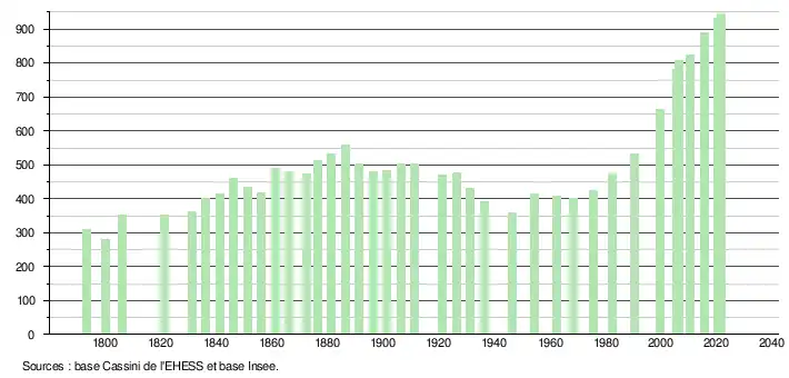 L'évolution du nombre d'habitants est connue à travers les recensements de la population effectués dans la commune depuis 1793. Pour les communes de moins de 10 000 habitants, une enquête de recensement portant sur toute la population est réalisée tous les cinq ans, les populations légales des années intermédiaires étant quant à elles estimées par interpolation ou extrapolation[26]. Pour la commune, le premier recensement exhaustif entrant dans le cadre du nouveau dispositif a été réalisé en 2005[27].