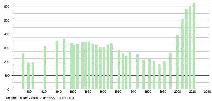 L'évolution du nombre d'habitants est connue à travers les recensements de la population effectués dans la commune depuis 1793. Pour les communes de moins de 10 000 habitants, une enquête de recensement portant sur toute la population est réalisée tous les cinq ans, les populations légales des années intermédiaires étant quant à elles estimées par interpolation ou extrapolation[11]. Pour la commune, le premier recensement exhaustif entrant dans le cadre du nouveau dispositif a été réalisé en 2006[12].