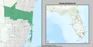 Le 23e district congressionnel de Floride est une circonscription électorale du Congrès américain , située dans la région du Grand Miami et couvrant des parties du sud du Comté de Broward et du nord du Comté de Miami-Dade . Le district comprend des villes telles que Weston, Davie, Pembroke Pines et Aventura. Le quartier comprend également l'aéroport international de Fort Lauderdale-Hollywood et l'université Nova Southeastern. Le district est l'une des plus fortes concentrations de Juifs américains, composé d'environ 24% de l'électorat[1].