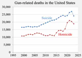 - En 2010, 67 % de tous les homicides commis aux États-Unis ont été commis par une arme à feu[17]. En 2012, il y avait 8 855 homicides commis à l'arme à feu aux États-Unis, 6 371 d'entre eux attribués à l'arme de poing[18]. Aux États-Unis en 2012, 64 % des décès liés aux armes à feu étaient des suicides[19]. En 2010, il y avait 19 392 suicides et 11 078 homicides liés aux armes à feu aux États-Unis[20]. En 2010, 358 meurtres impliquant un fusil et 6 009 mettant en cause une arme de poing ont été signalés; 1 939 autres ont été reportés avec un autre type d'arme à feu non-spécifié[21].